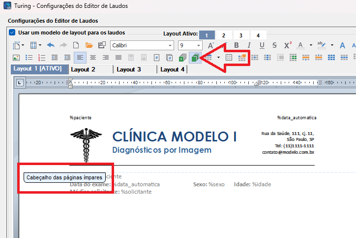 Os laudos gerados pelo Turing podem ter um cabeçalho personalizado contendo o logotipo e nome da clínica (ou qualquer outra informação que se deseje) e também um rodapé com numeração de página, por exemplo. Aprenda como fazer isso seguindo as instruções abaixo: