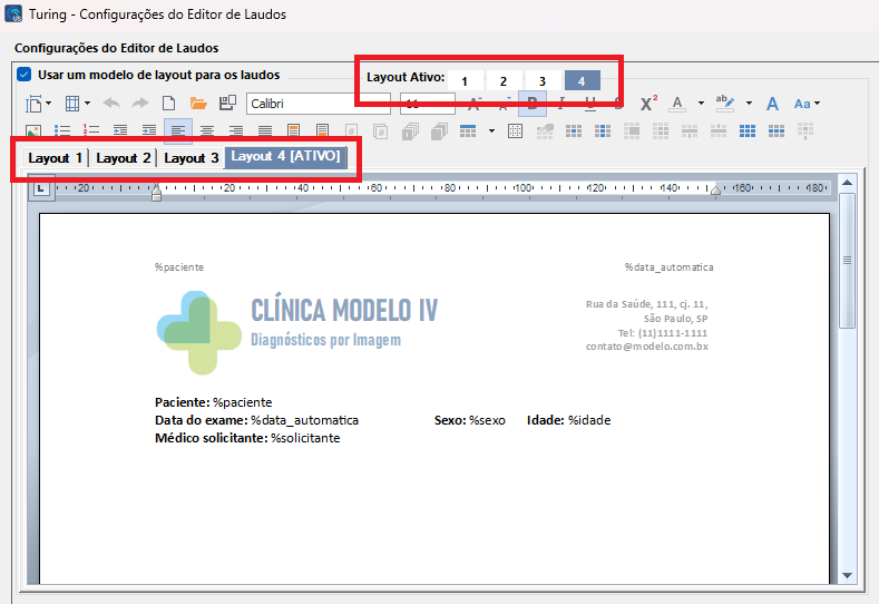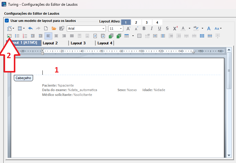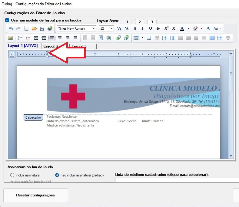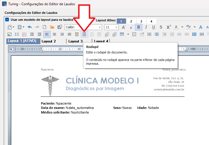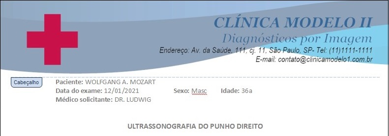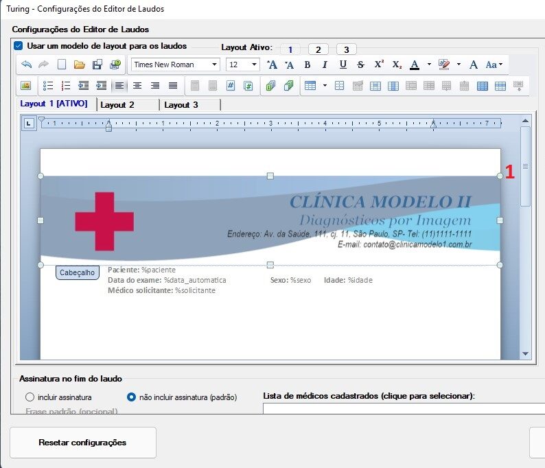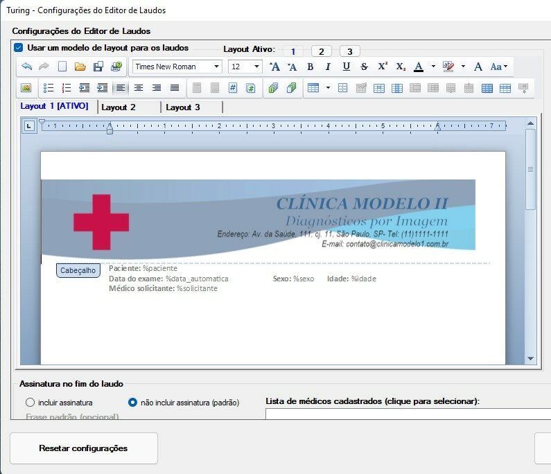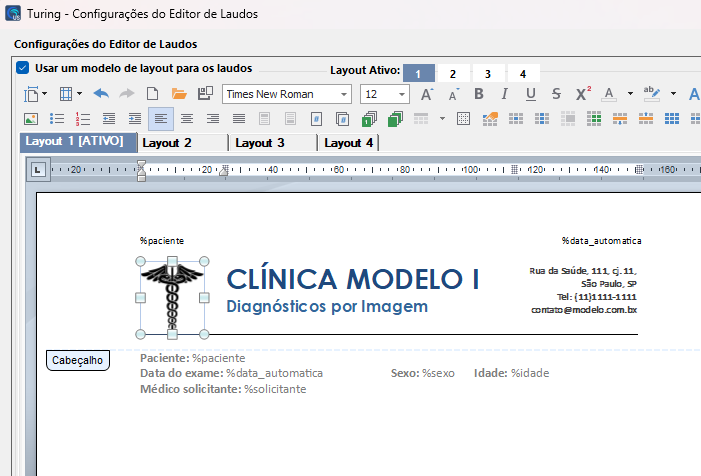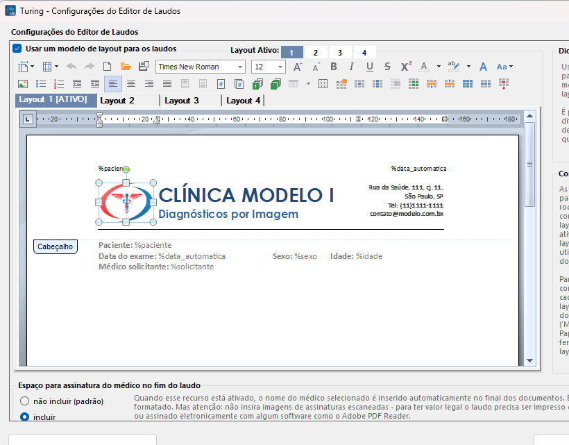 Repare que logo abaixo do cabeçalho há um texto modelo com os campos “Paciente”, “Data do exame”, “Sexo“, “Idade” e “Médico solicitante“. Esses campos também podem ser alterados à vontade. É aconselhável manter as expressões especiais %paciente, %data_automatica, %sexo, %idade e %solicitante pois dessa forma o Turing substituirá estas palavras automaticamente pelo nome do paciente, data do exame, sexo, idade e nome do médico solicitante caso tenham sido preenchidos na janela principal do programa.