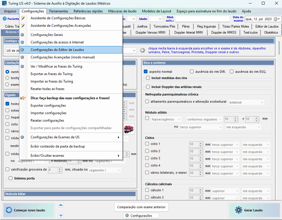 1) Abra o Turing. Acesse o menu “Configurações” e clique em “Configurações do editor de laudos”