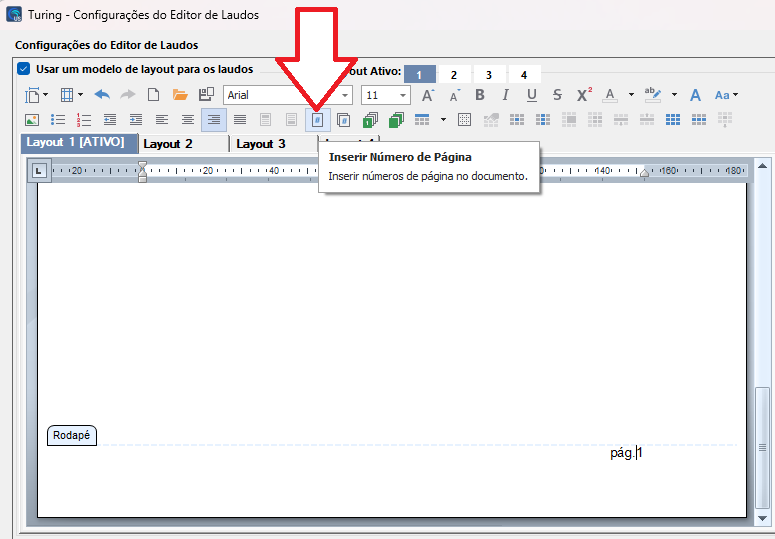 8) Em seguida, insira no rodapé as informações que desejar. Se quiser que ele mostre o número da página, por exemplo, basta clicar no botão mostrado pela seta na figura abaixo.